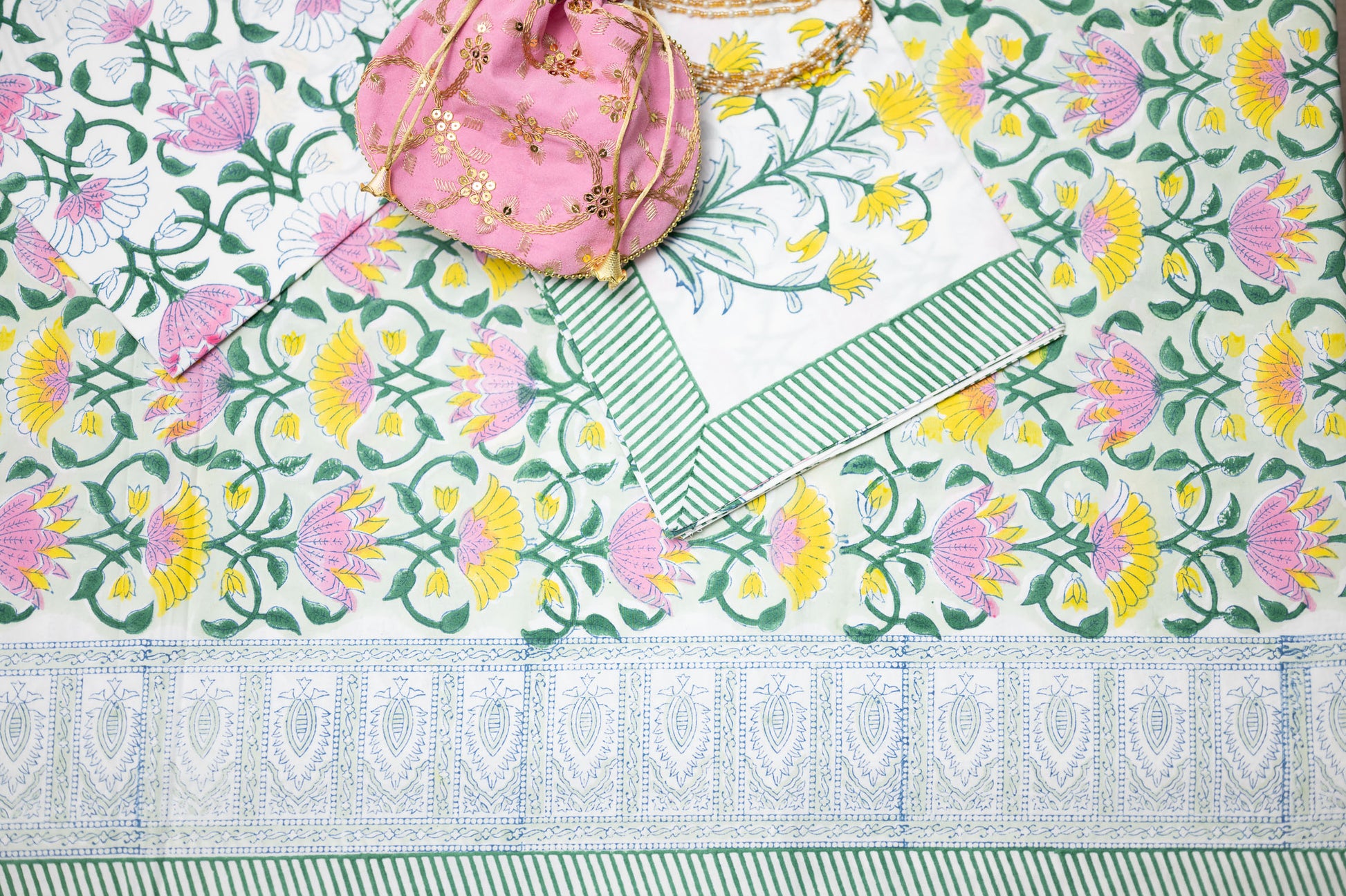 Lotus Bloom 100% Cotton Handblock Printed Flat sheet with Pillow covers