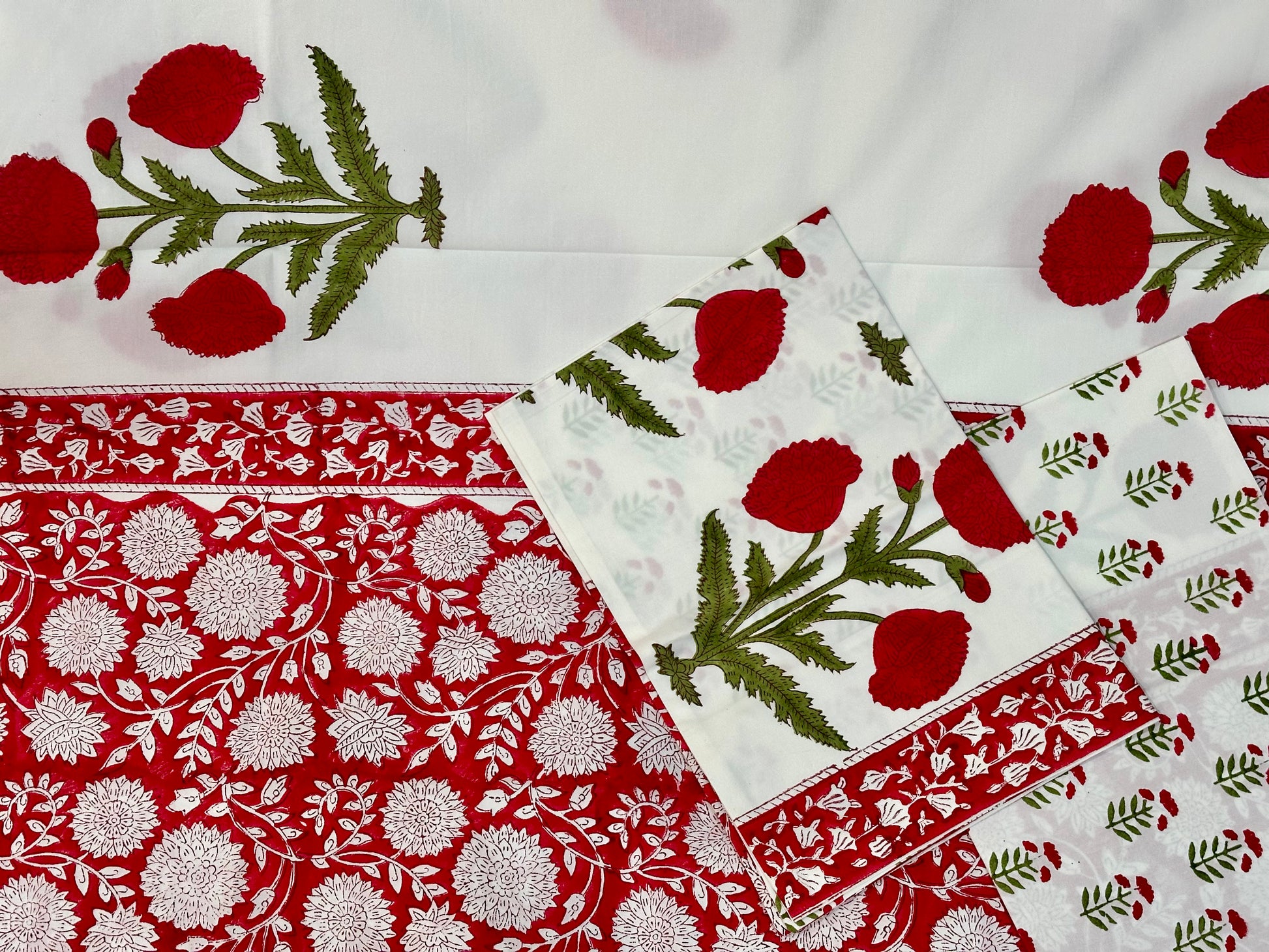 Scarlet Flora 100% Cotton Handblock Printed Flat sheet with Pillow covers