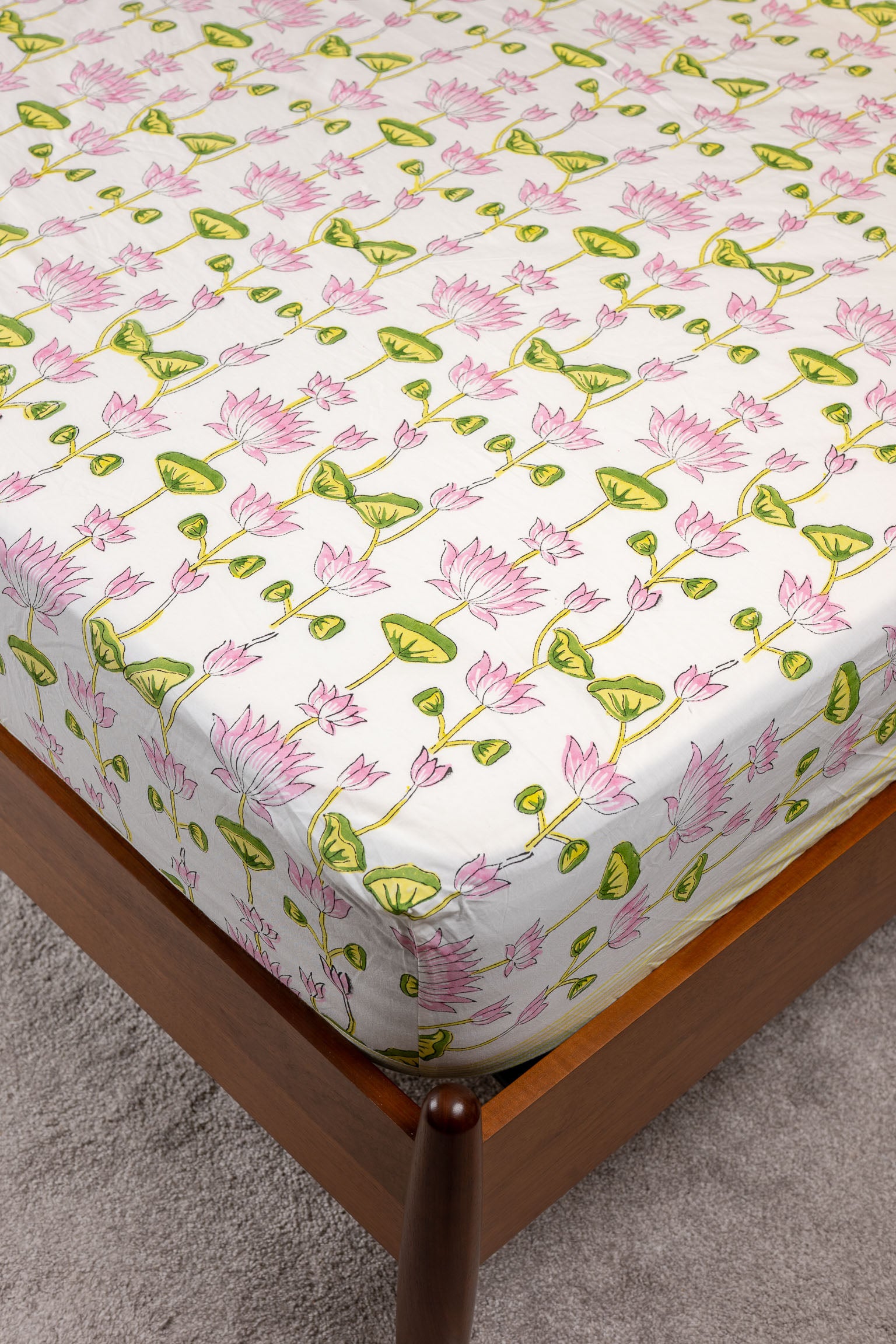 Tranquil Lotus 100% Cotton Handblock Printed Fitted sheet with Pillow covers